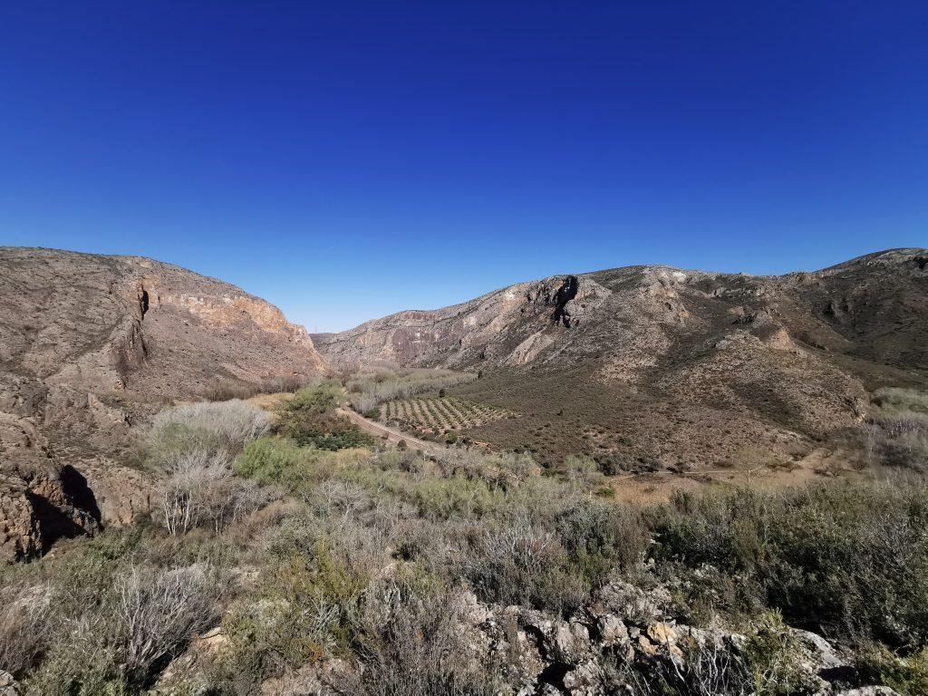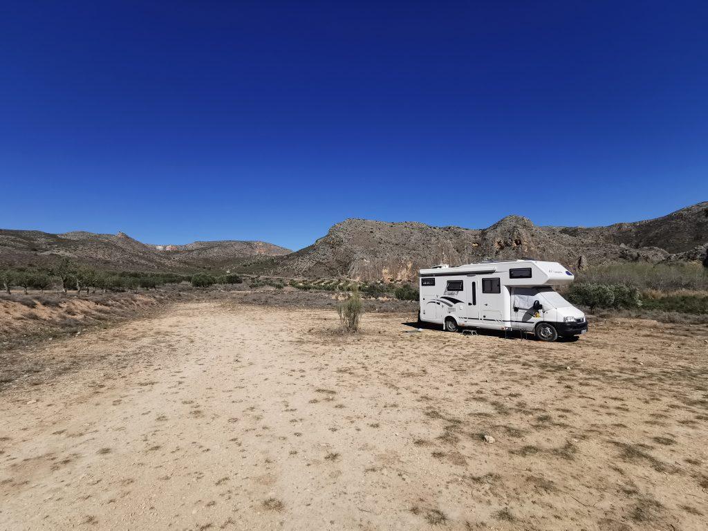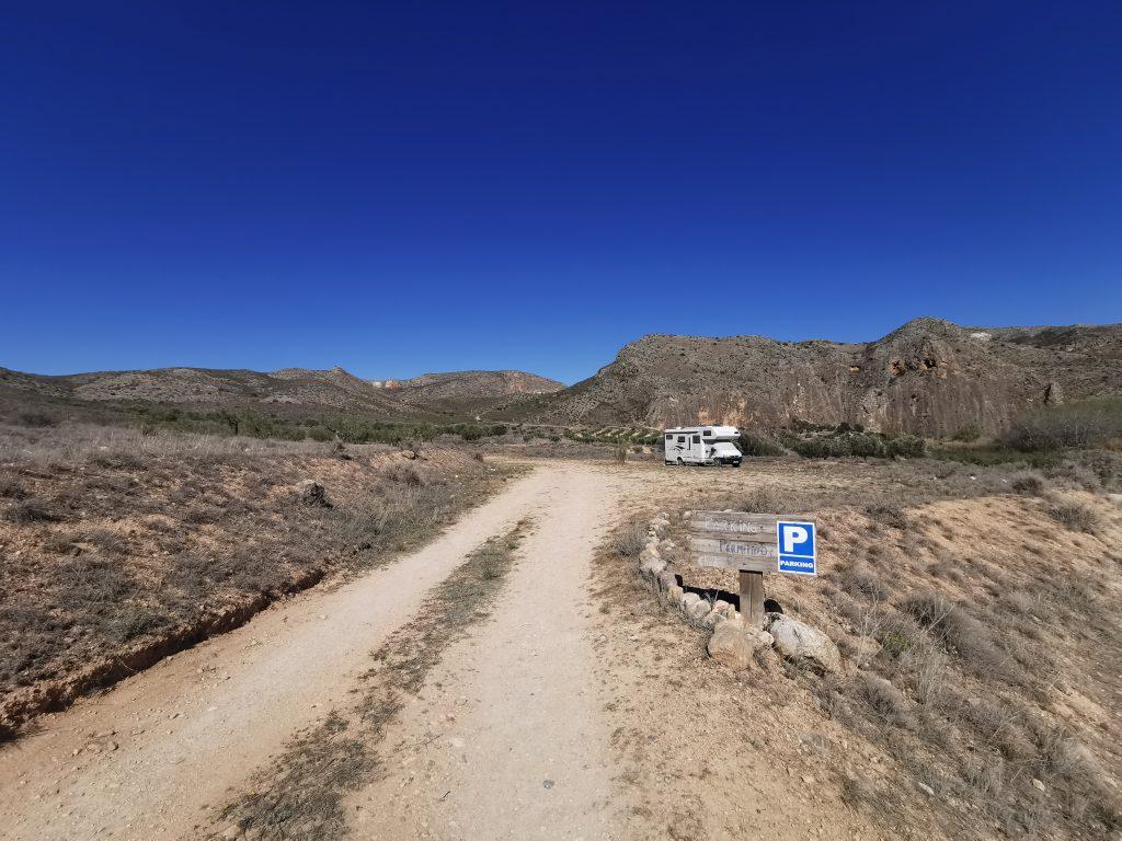 Heute fahren wir 150 km durch drei Gemeinschaften: Kastilien – La Mancha (von La Cabrera), Kastilien und León (über Arcos de Jalón) und Aragonien (in die Nähe des Dorfes Chodes). Über einen ca. 1,6 km langen Feldweg gelangen wir fast „ans Ende der Welt“ – einem Paradies für (Ironie an!) Kletternde und Wandernde. (Ironie aus!). Wir freuen uns, hier zu sein.