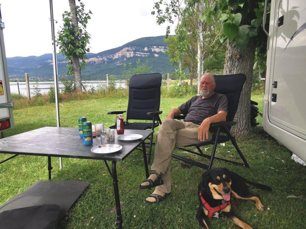 Die heutige Etappe hatte es „in sich“. Zwar waren es überschaubare 250 km, doch ohne Mautstraßen tuckelten wir 5 Std. über zumeist Landstraße bei 30 Grad. Soweit so gut. Unser 1. auserkorener Stellplatz in Geneuille war voll belegt und es gab zudem kaum Wendemöglichkeiten, mit Anhänger überhaupt nicht. Also abkoppeln, Wohnmobil wenden, wieder ankoppeln (ich kam ganz schön ins Schwitzen) und 24 km weiter. Bei der Hitze lief wortwörtlich 2 km vor unserem Ziel der linke vordere Autoreifen heiß, dies zeigte zumindest unser Reifendrucksensor mit einem lauten Warnsignal an. Bevor wir morgen weiterfahren, müssen wir unbedingt den Reifendruck prüfen.