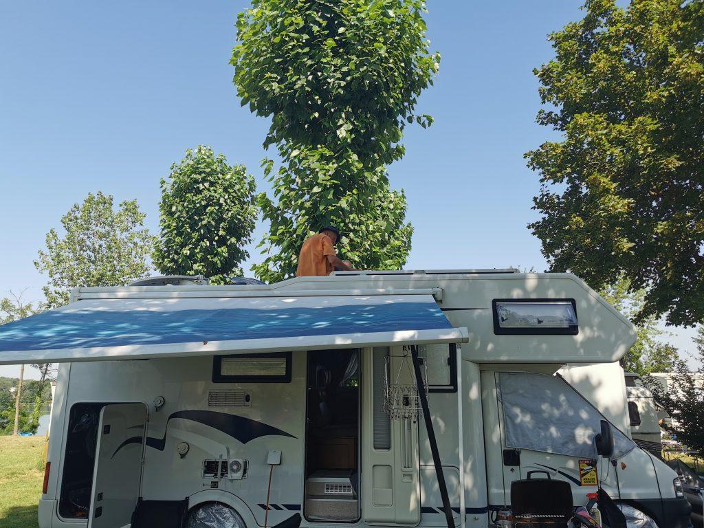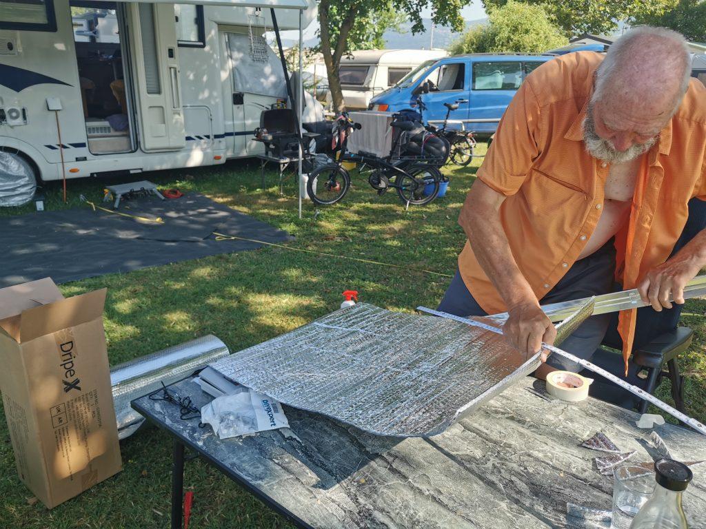 Ja, 37° ist heftig. Wir haben eine Außendusche neben dem Wohnmobil. Tägliches, mehrmaliges Duschen ist eine herrliche „Pflicht“. Die Schatten spendenden Bäume auf unserem Platz schätzen wir sehr. Die Folie ist eine Aluminiumdämmfolie. Wir warten noch ab, wie sie sich bewährt. Alles Liebe! Martina und Co.