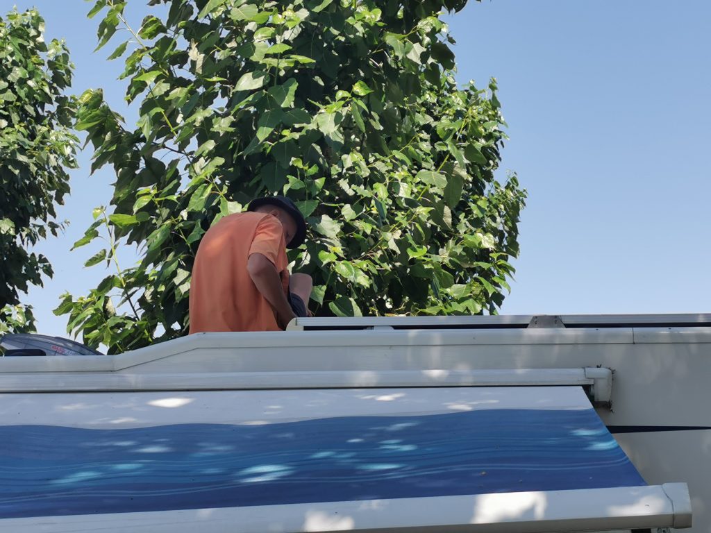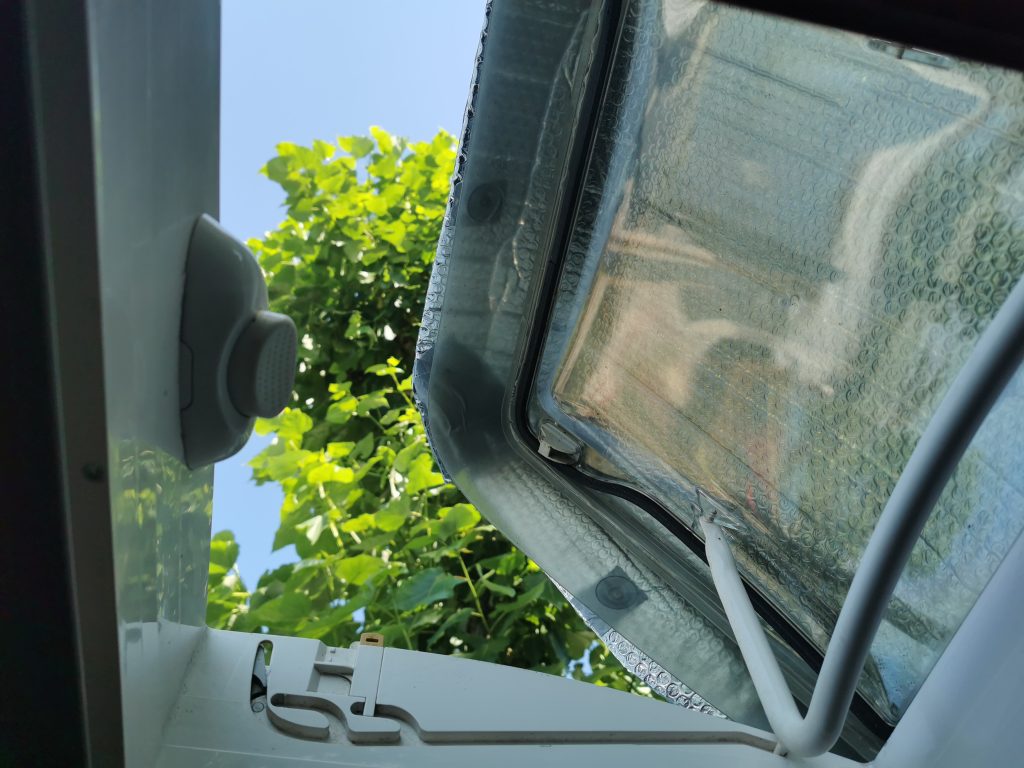 Gestern hatten wir im Wohnmobil 37°🥵 . Unser Maxx-Fan (Deckenventilator) arbeitet täglich auf Hochtouren. Unsere Fenster heizen bei diesen Temperaturen sehr auf und geben die Wärme nach innen ab. Wolfgang hat die geniale Idee, die Fenster von oben mit spezieller Folie zu isolieren und mit Saugnäpfen zu befestigen. Die Folie ist heute Morgen angekommen.