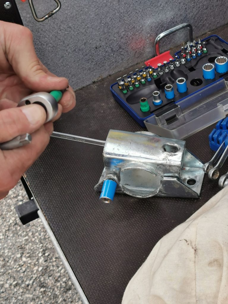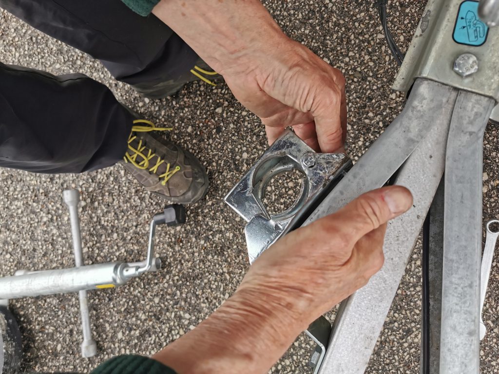 Auf unserer Route sahen wir uns mehrere Stellplätze an. So auch in Fabriano (Region Marken). Die Zufahrt zum Platz, etwas steil. Es gab einen Aufschlag im hinteren Bereich. Beim Überprüfen, stellten wir fest, dass die Halterung am Stützrad des Anhängers einen Schlag bekommen hat und sehr verbogen ist (war) . Hier sind jetzt die „Kemmlerschen Handwerkskünste“ gefragt.