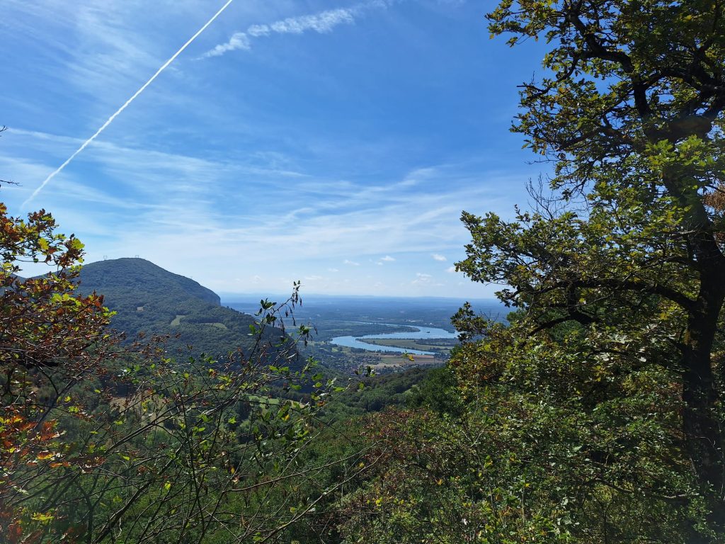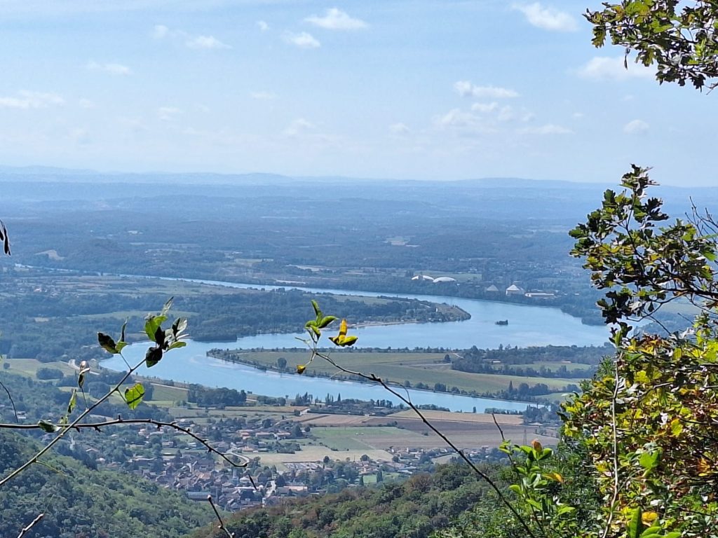Wir machen uns langsam auf den Rückweg. Serge fährt noch eine Schleife, um uns einen Blick auf die Rhône und unseren Campingplatz von oben zu geben.