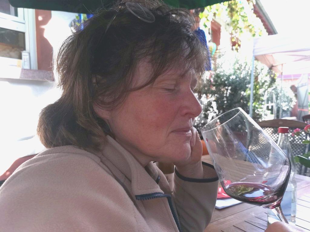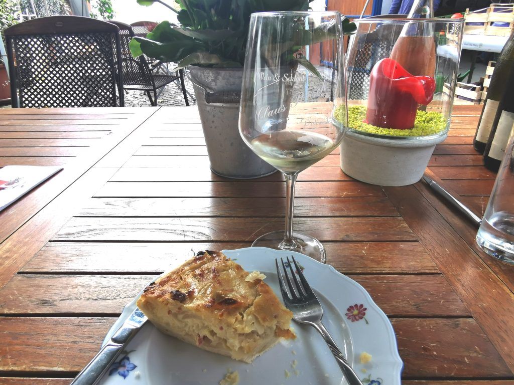 Heute bleibt unsere Küche kalt, da wir noch mal beim Weingut Rösch vorbeischauen. Unsere Idee: eine kleine Weinprobe mit entsprechender vorheriger „Unterlage“. Wir sind die einzigen Gäste und genießen mehrere Stücke vom selbstgemachten frischen Zwiebelkuchen der Chefin.