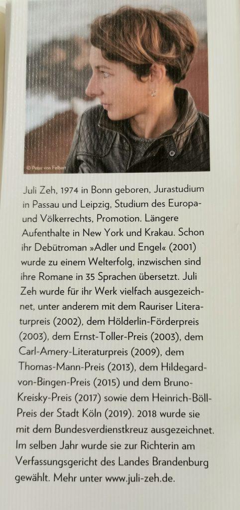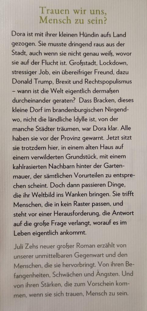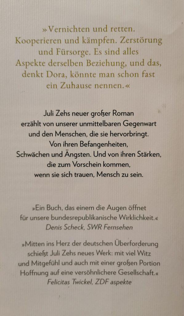 Manchmal sagt man: „Dieses Buch hat mich gefunden“, oder „es kam zur richtigen Zeit“ 😉 Das Buch von Juli Zeh, unser einziges „richtiges“ fest eingebundenes Buch (wir lesen überwiegend digital wg. des Platzes und Gewichtes), von einer Freundin im September 2021 geschenkt, hat „mich vorgestern gefunden“.