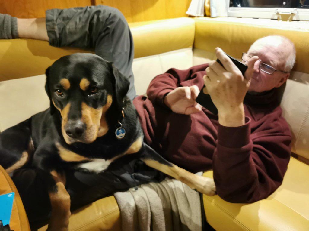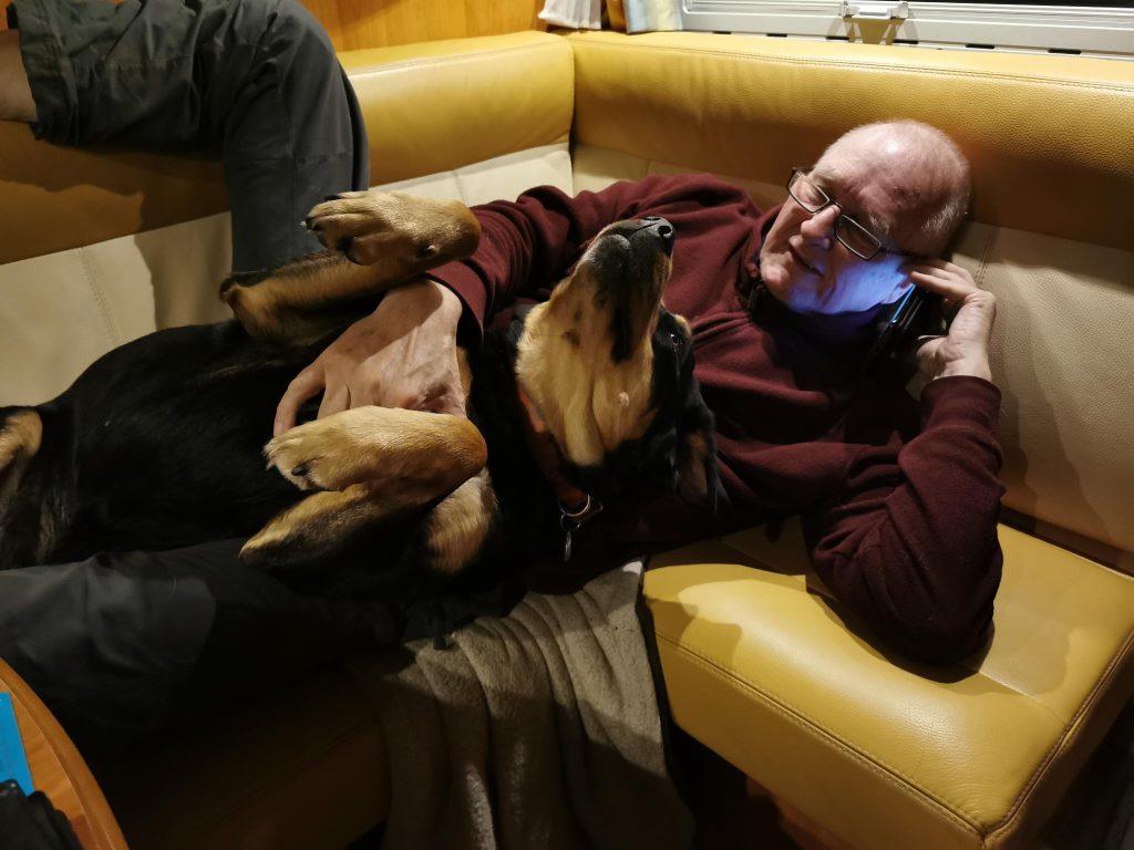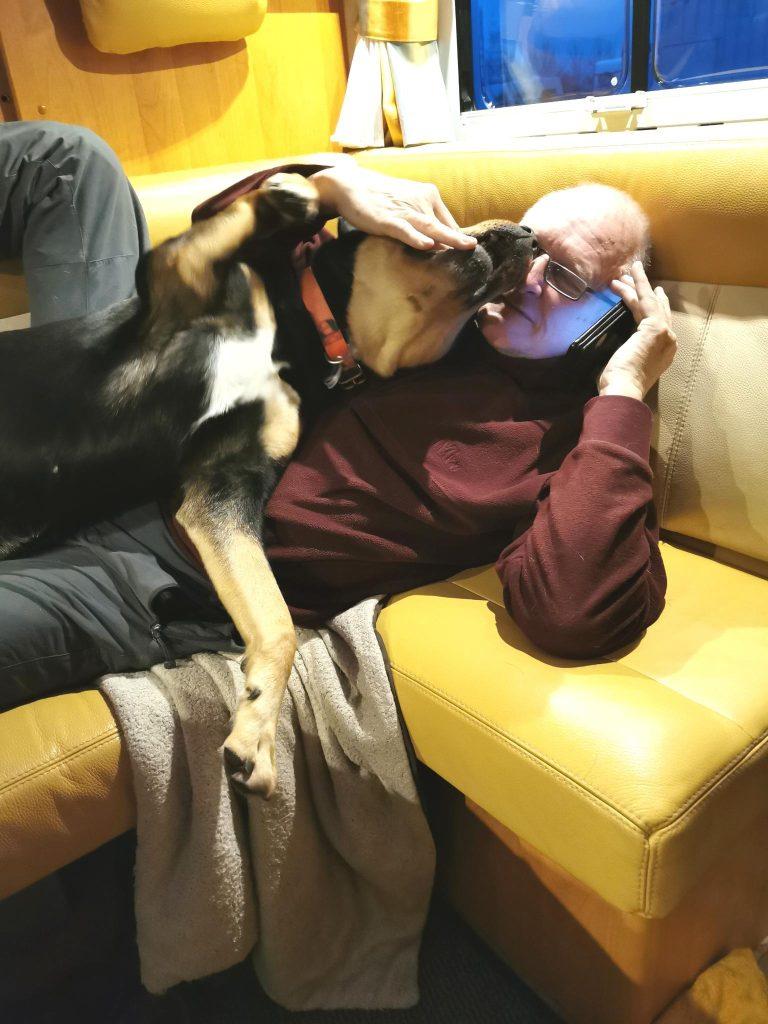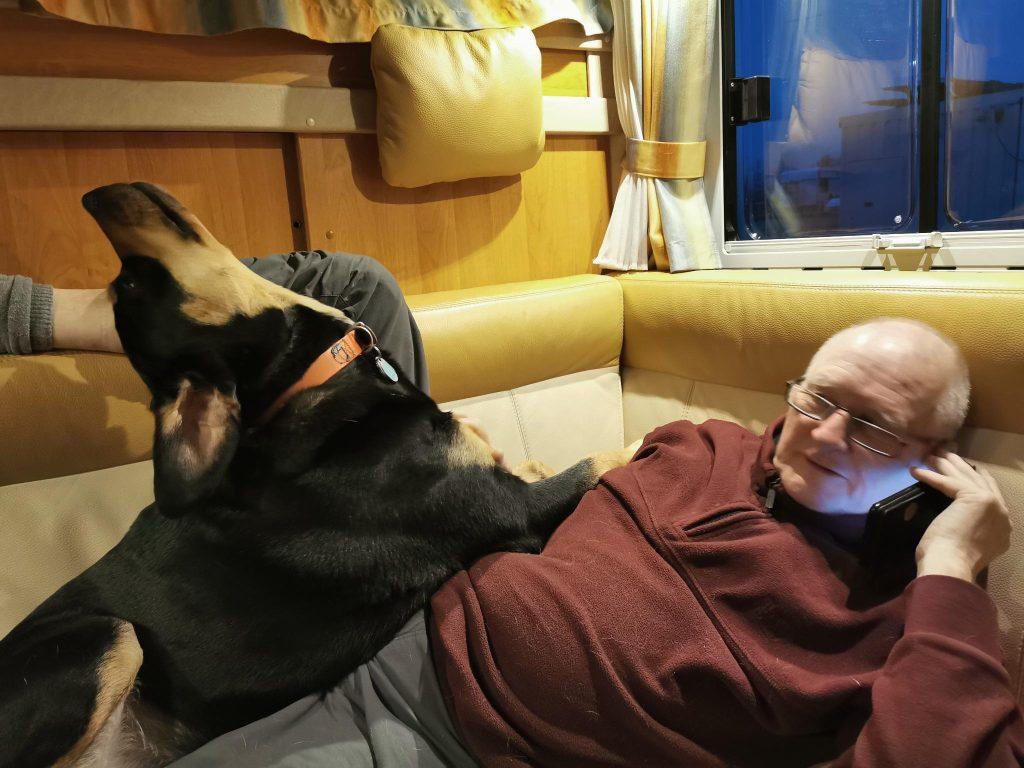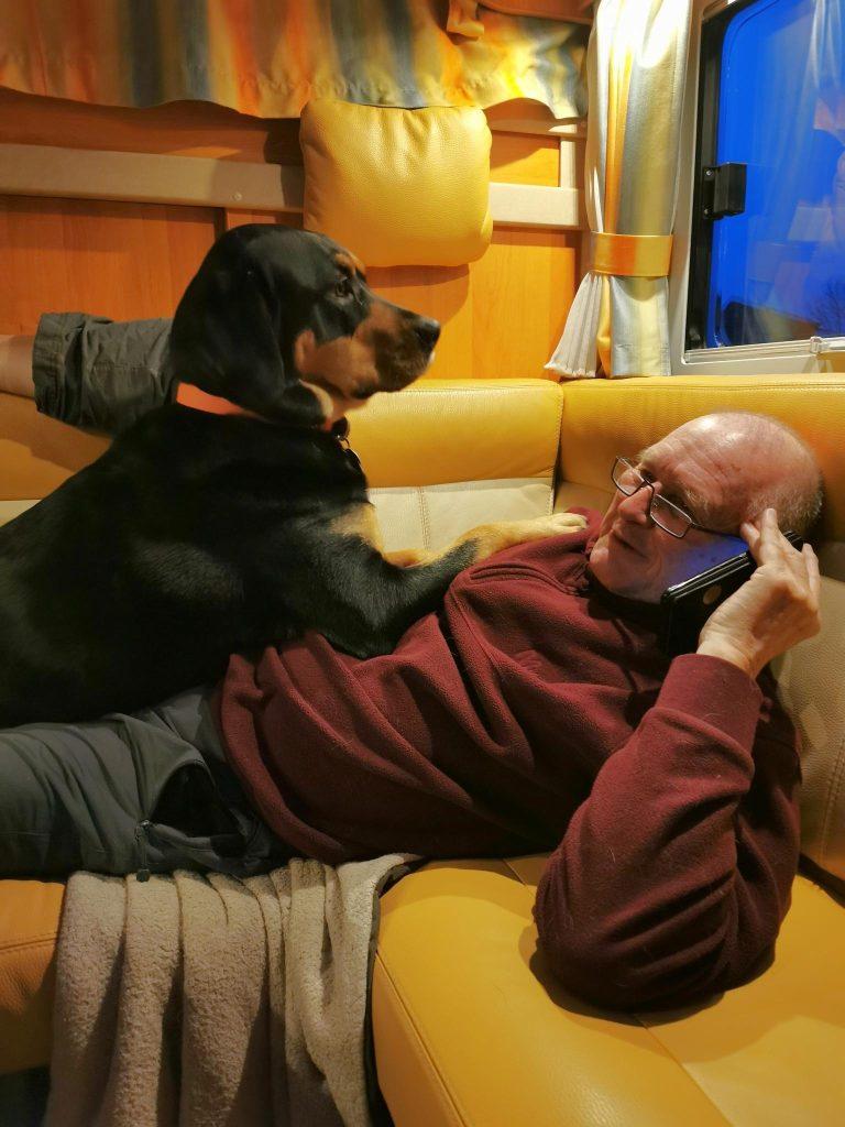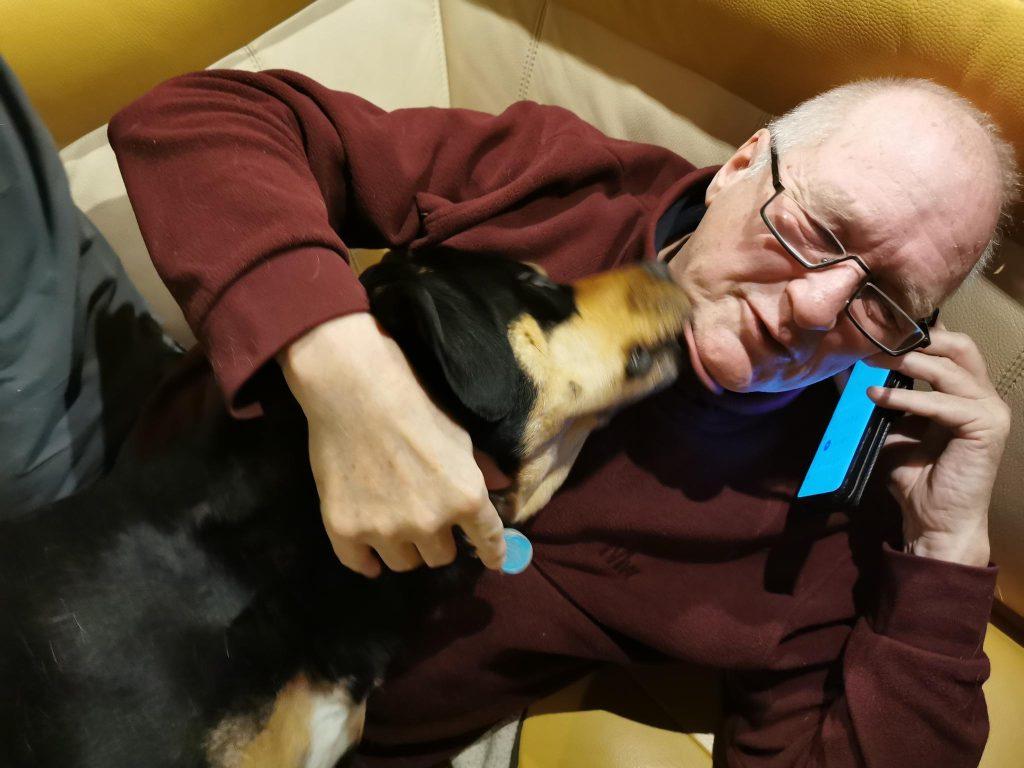 Wenn mein Herrchen Wolfgang telefoniert, weiß ich genau, wie ich seine Aufmerksamkeit trotzdem bekomme.