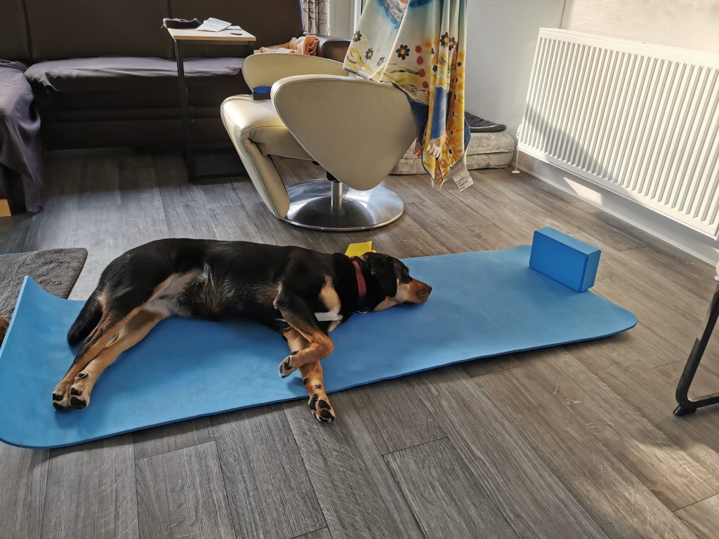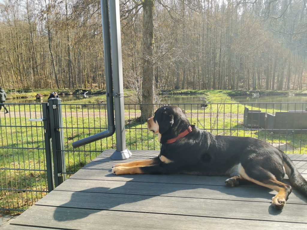 Ava fühlt sich sichtlich wohl und kann auf ihrem Territorium so richtig ihren großen Schweizer Sennenhund-Anteil ausleben.